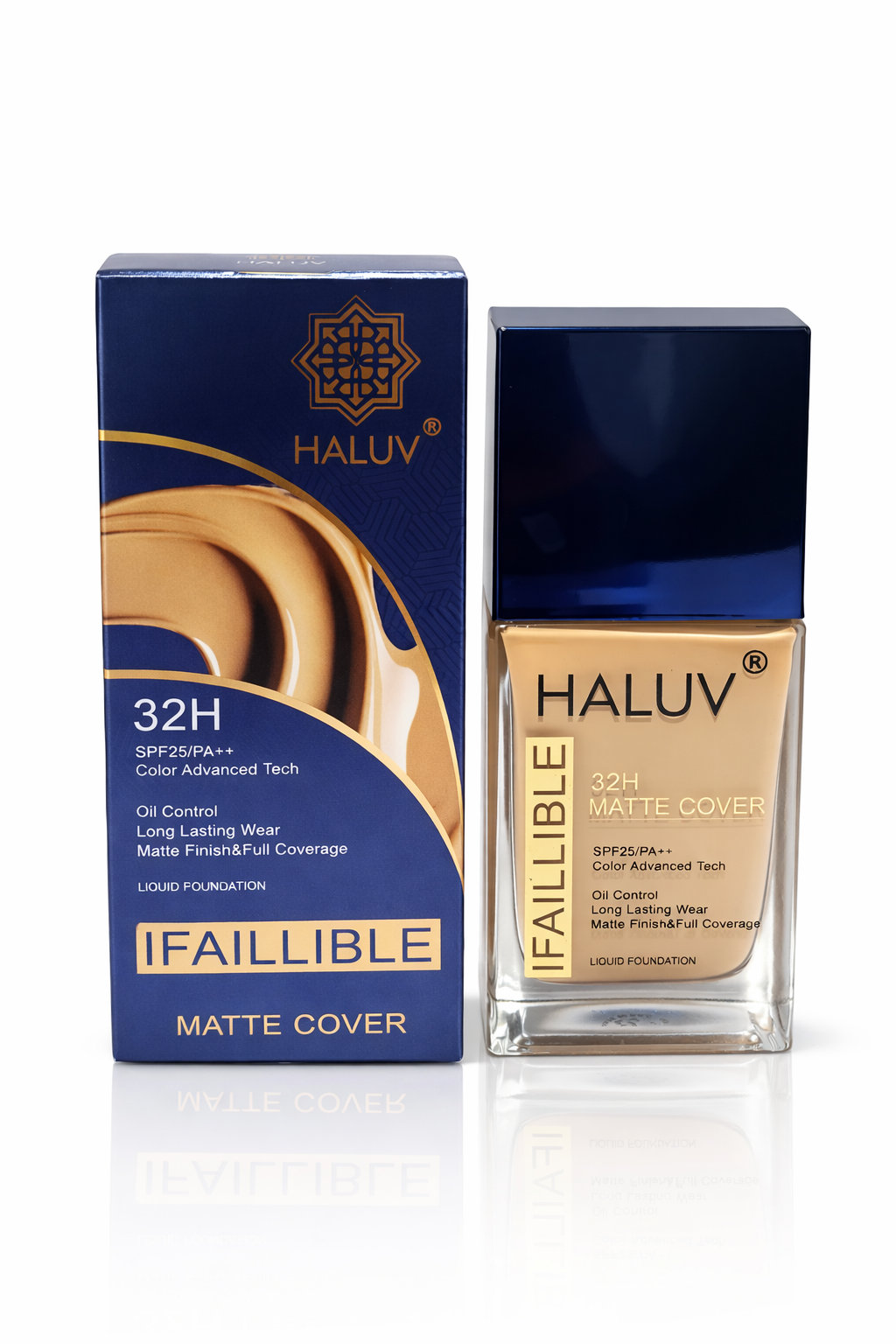 Haluv Infaillible Matte Cover Foundation delivers 32-hour long-lasting wear with SPF 25 protection. Its advanced oil-control formula provides full coverage and a smooth matte finish for flawless, shine-free skin all day.